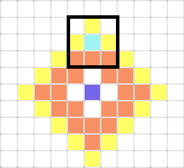 実際の攻撃範囲は、選択した中心(水色)の周囲8マスの黒枠内となります。 |